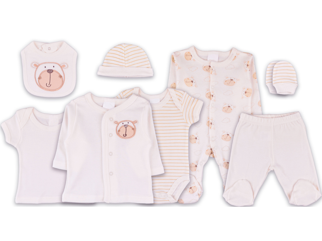 Roztomilý 8dílný bavlněný set (100 % bavlna) v teplé krémové barvě s motivem medvídka. Unisex provedení - ideální i pokud ještě neznáte pohlaví miminka. Skvělý dárek pro novopečené rodiče :)