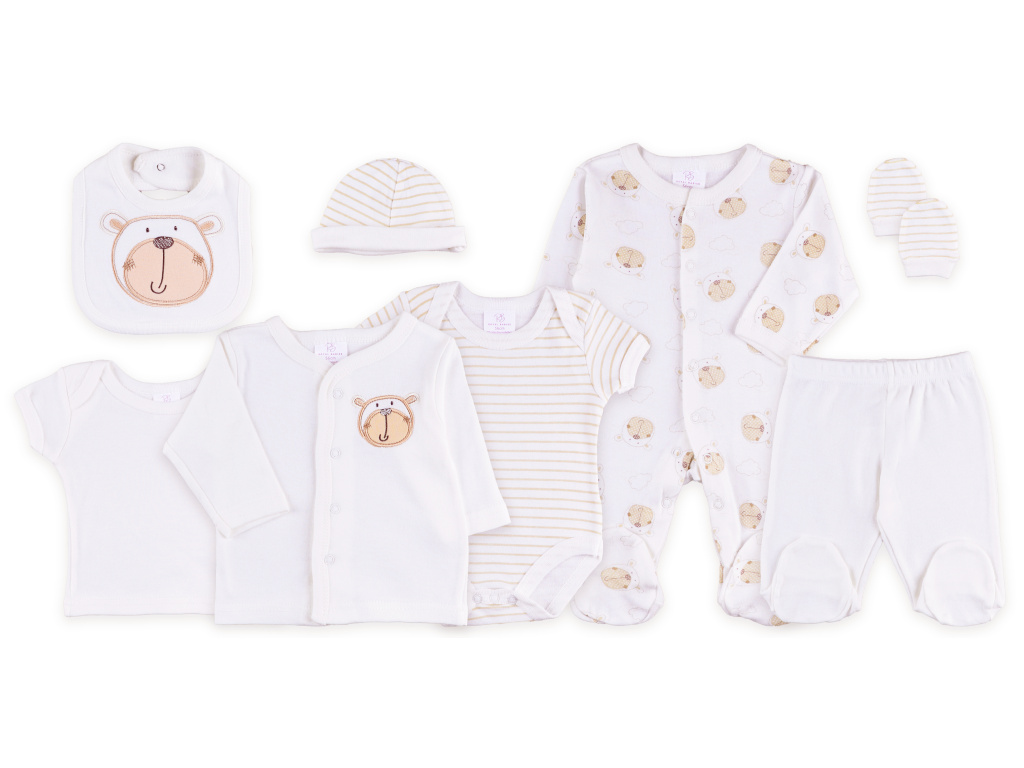 Roztomilý 8dílný bavlněný set (100 % bavlna) v teplé krémové barvě s motivem medvídka. Unisex provedení - ideální i pokud ještě neznáte pohlaví miminka. Skvělý dárek pro novopečené rodiče :)