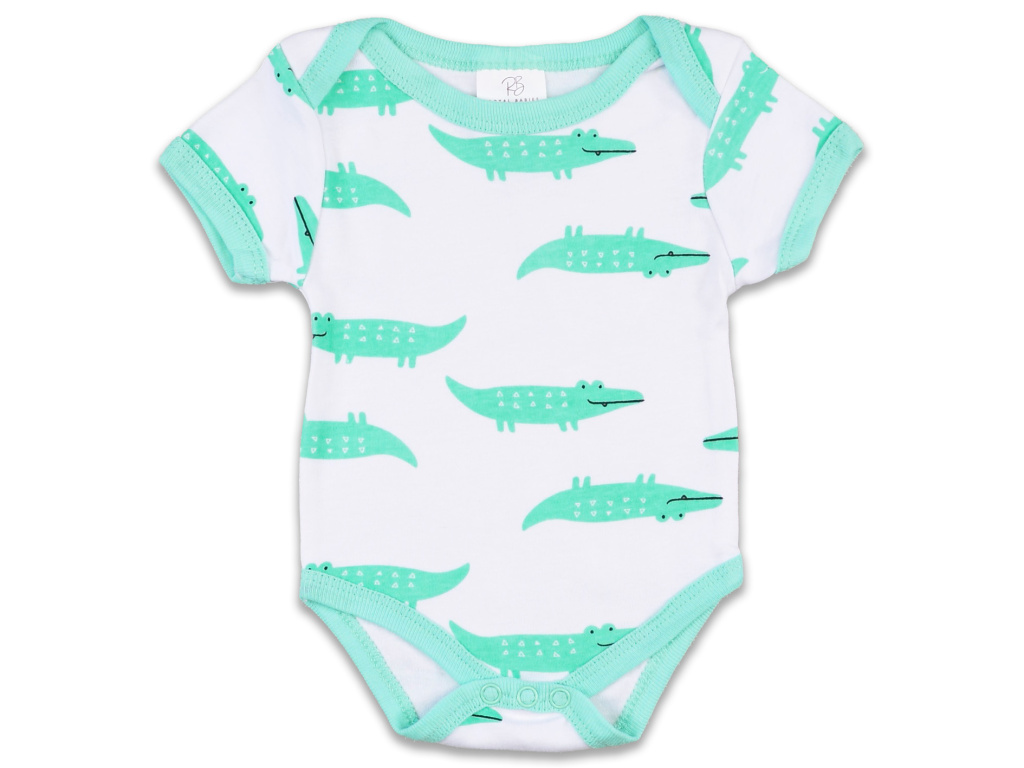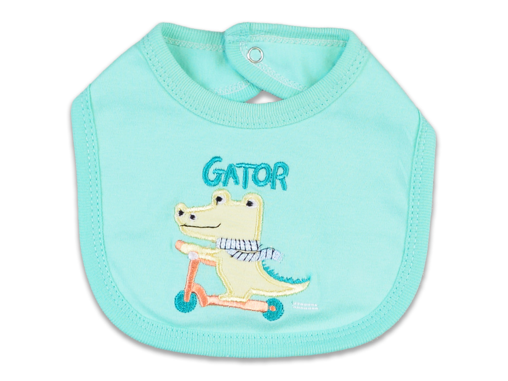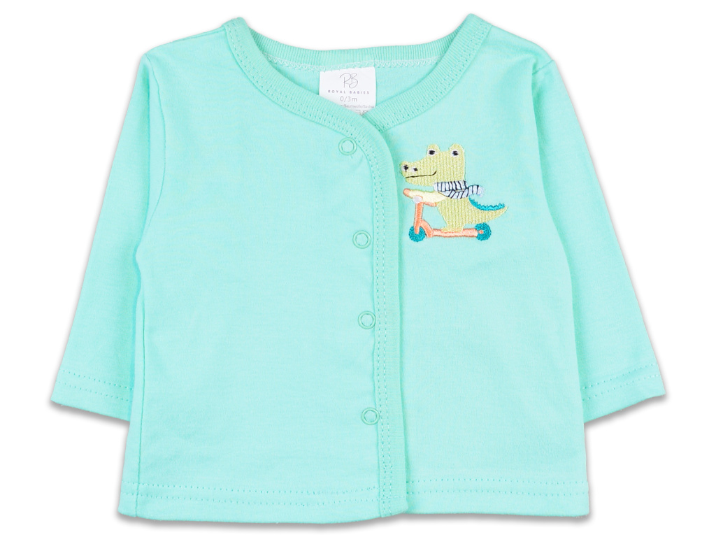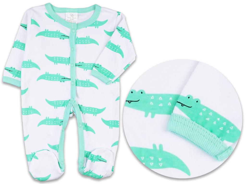 Všechny kousky jsou barevně sladěné do jemné mintové a bílé, s hravým potiskem krokodýlků a výšivkou jezdícího krokodýla na koloběžce, která dodává setu originální a přátelský vzhled. Praktické zapínání usnadňuje oblékání a přebalování.