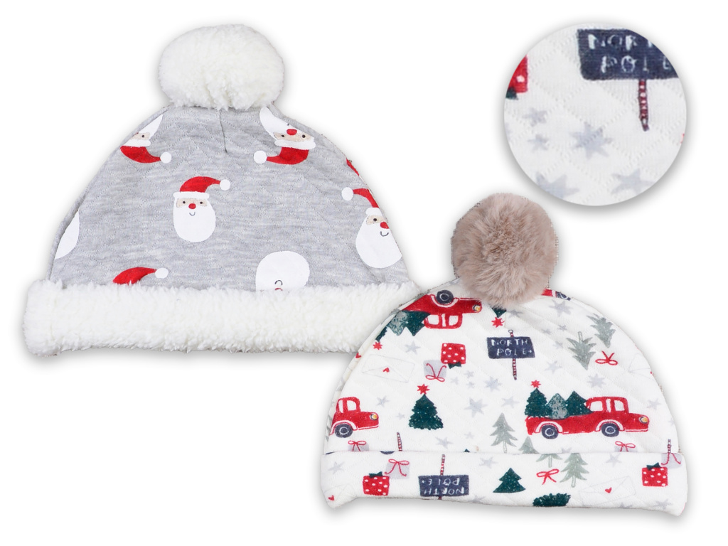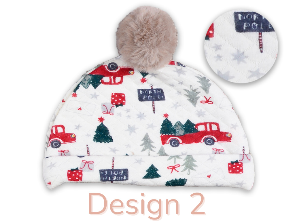 Zimní dětská prošívaná čepice s bambulkou, obvod cca 40 cm – hřejivá s vánočním motivem