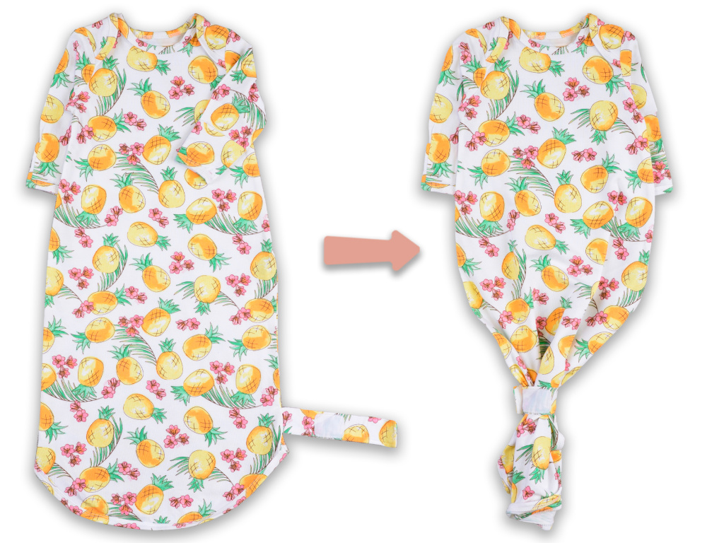 Kojenecká košilka s praktickým uzlem na suchý zip, který usnadňuje přebalování. Díky promyšlenému designu lze košilku snadno proměnit v letní spací pytel, ideální pro teplé noci. Rukávy jsou navrženy tak, aby se daly přehrnout, čímž vytvoří ochranné rukavičky pro citlivé ručičky miminka.