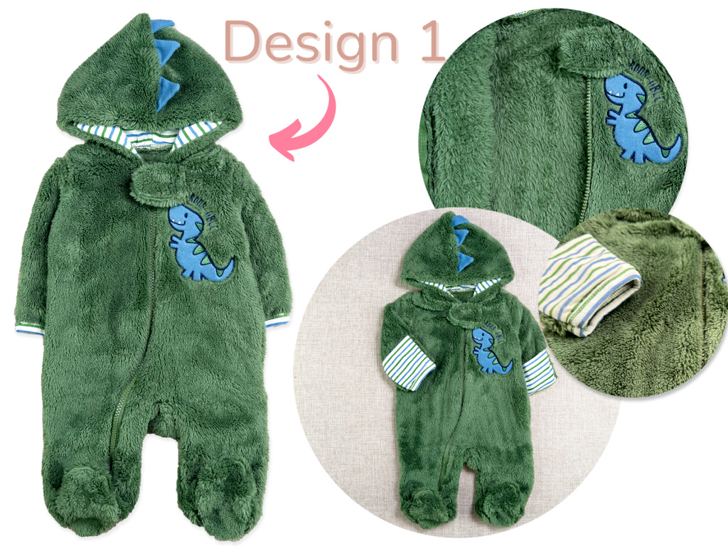 Zips po celej dĺžke výrazne uľahčuje obliekanie aj prebaľovanie. Kapucňa má 100% bavlnenú podšívku, jemnú a vhodnú pre citlivú pokožku. Dinosauří motív a ozdobné prvky dodávajú overalu hravý a milý vzhľad.