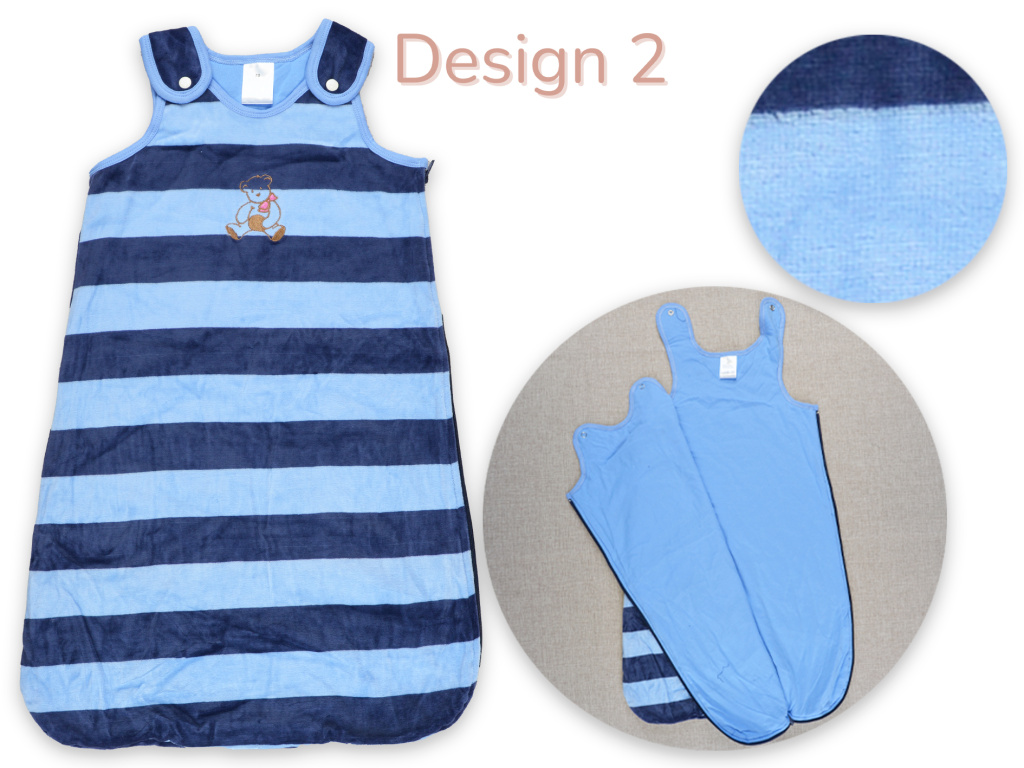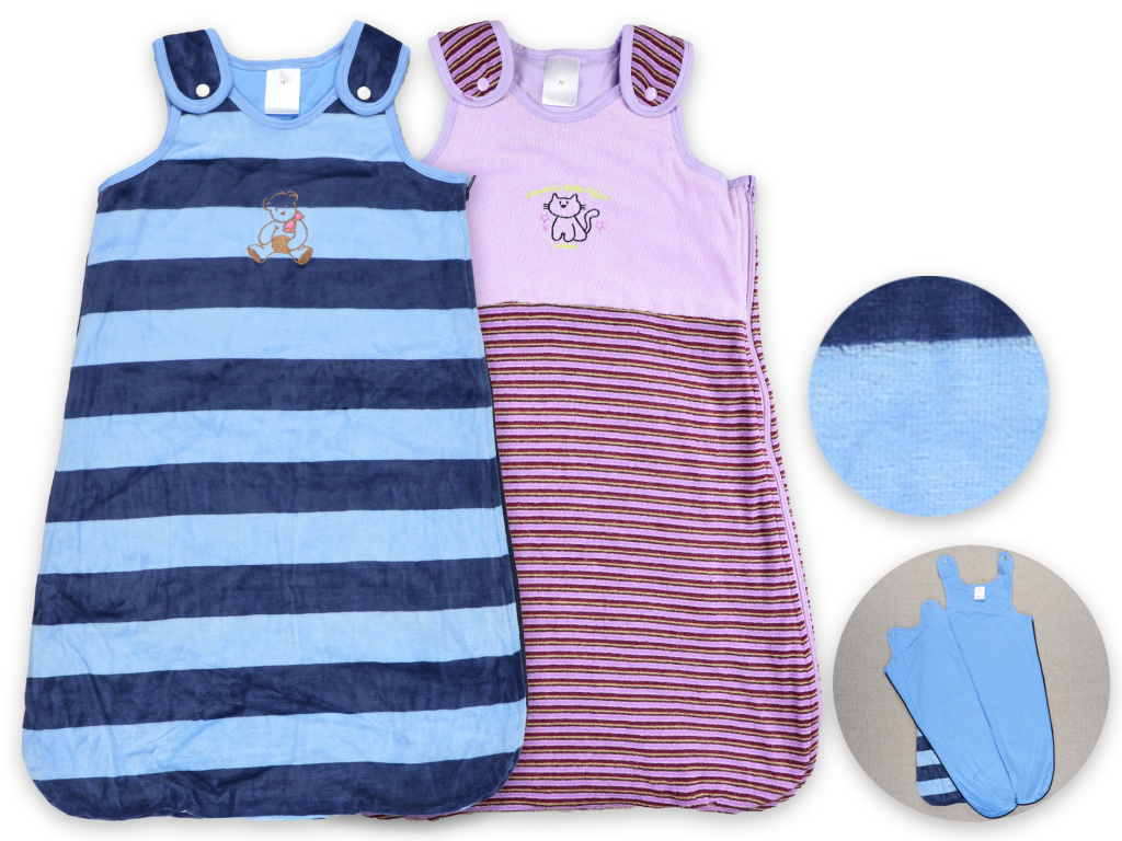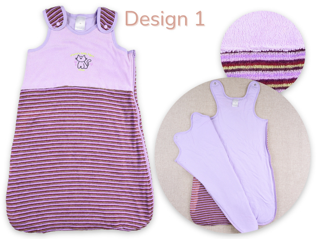 Ramínka jsou opatřena pevnými patentkami, které drží spací pytel na místě a usnadňují manipulaci. Dostupný ve dvou barevných variantách – jemně modré s pruhy a výšivkou medvídka nebo ve fialovo-hnědých pruzích s roztomilou kočičkou. Díky nadčasovému designu se hodí pro holčičky i chlapečky.